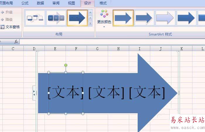 3、鼠標左鍵選擇一個流程的樣式,excel表格中就出現了該流程,這里選擇了(連續箭頭流程),如下圖所示。