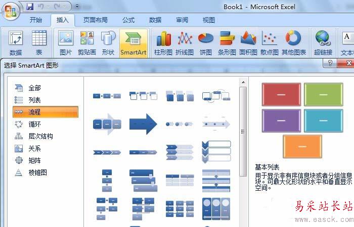 2、鼠標左鍵選擇一個流程的樣式,excel表格中就出現了該流程,這里選擇了(基本流程),如下圖所示。