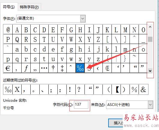 4、拉動右側的滾動條,找到千分之一符號,單擊選中該符號,我們可以看到下方它的字符代碼是137,這跟使用alt+137相吻合了。點擊插入,千分號就插入到文檔中了。