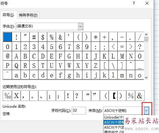 3、在彈出的符號對話框中,看到右下方的“來自”,點擊向下箭頭在彈出的幾個選項中單機選擇“ASCII十進制”,對話框中的符號就顯示的是十進制的符號。