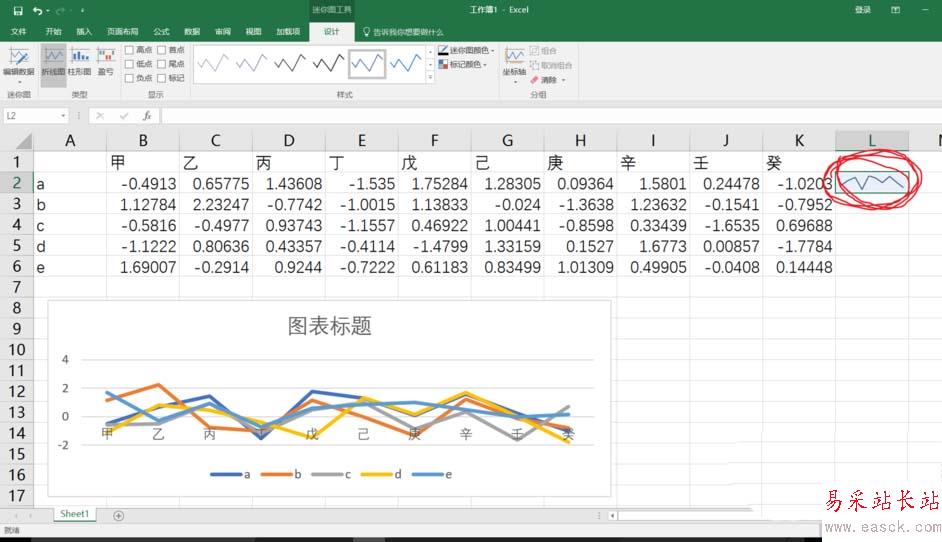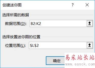 3、如上表,點(diǎn)擊L2框,然后選擇插入——迷你圖;首先使用折線圖。在數(shù)據(jù)范圍中填寫B(tài)2:K2。位置范圍填L2。然后看到L2網(wǎng)格處可以顯示該行的數(shù)據(jù)變化情況。