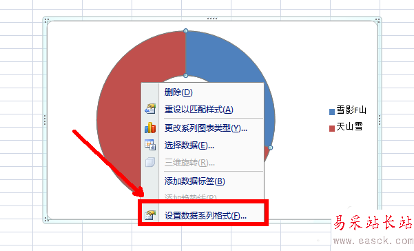 4、如圖,點擊圓環圖鼠標右鍵選擇最后一個選項進行調節圓環圖的形狀,顏色等。
