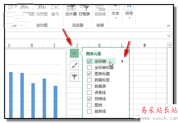 3、這時(shí),圖表的右上角,顯出三項(xiàng),其中一項(xiàng)有一個(gè)大的+號(hào),鼠標(biāo)點(diǎn)擊此+號(hào),右邊顯出菜單,鼠標(biāo)放在“坐標(biāo)軸”這里,右側(cè)即顯出一個(gè)小三角形。