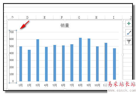 1、打開工作表,表中,已插入了柱形圖表。圖表左側(cè)縱坐標(biāo)軸是銷量數(shù)據(jù);圖表底部橫坐標(biāo)軸是月份。