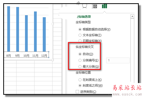 5、隨即,在工作表的右邊彈出小窗口;顯示坐標(biāo)軸的相關(guān)設(shè)置選項(xiàng)。在這里,我們看到“縱坐標(biāo)軸交叉”,下方默認(rèn)點(diǎn)選“自動(dòng)”