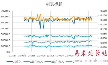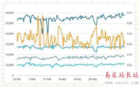 4、刪除圖表標(biāo)題、圖例,調(diào)節(jié)橫坐標(biāo)、兩個(gè)縱坐標(biāo)上下限,刪去縱網(wǎng)格線等,得到下圖。