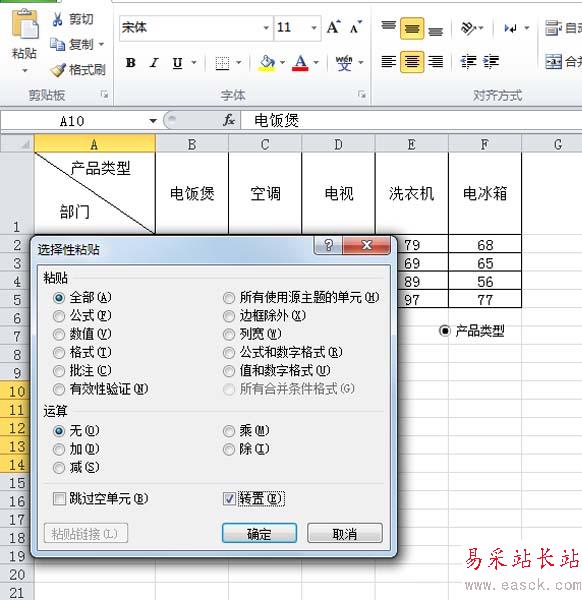 5、采用同樣的方法對(duì)“產(chǎn)品類型”選項(xiàng)按鈕進(jìn)行操作,選擇數(shù)據(jù)區(qū)域b1:f1,執(zhí)行復(fù)制操作,接著在單元格a10中執(zhí)行選擇性粘貼,選擇轉(zhuǎn)置,將行轉(zhuǎn)置為列。