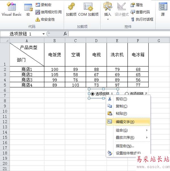 3、選擇選項(xiàng)按鈕控件1,右鍵單擊從下拉菜單中選項(xiàng)編輯文字選項(xiàng),修改為部門,同樣方法修改選項(xiàng)按鈕2為產(chǎn)品類型。
