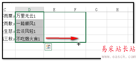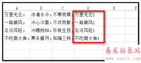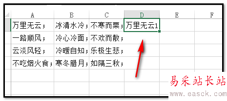 3、按回車鍵,D1即得到:萬里無云1,在D1單元格點下,鼠標放在單元格右下角,鼠標就成+字。