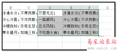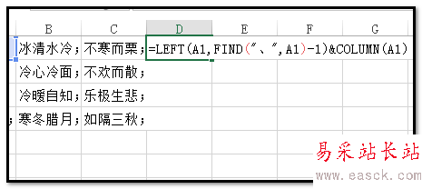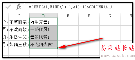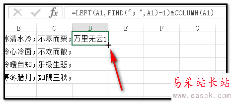 2、操作如下:在D1單元格輸入:=LEFT(A1,FIND(";",A1)-1)&COLUMN(A1)