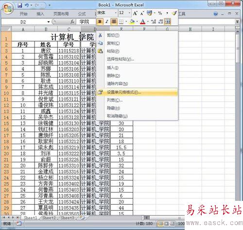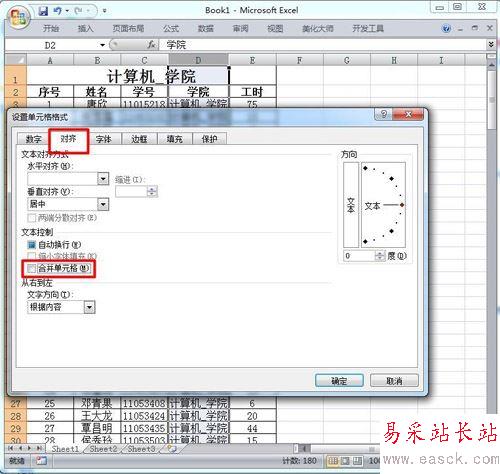 5、解決這一問題需要首先選中你要編輯的那一列信息,單擊鼠標右鍵,選擇”設置單元格格式“,在單元格格式窗口中選擇"對齊"中取消合并單元格(去掉勾)