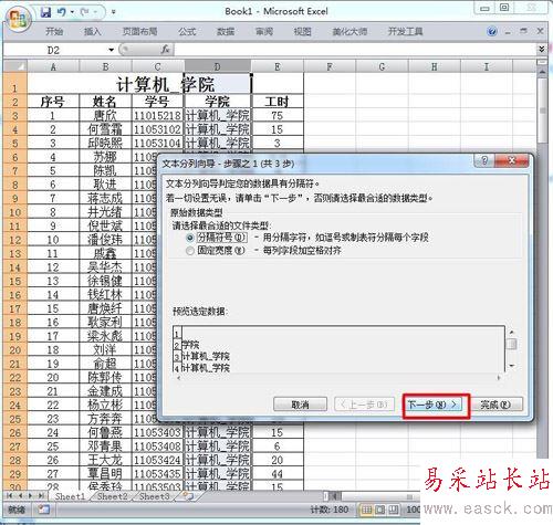 3、點擊"分列",在出現的窗口中點擊"下一步",然后再窗口中選擇分隔符等,進行分列。