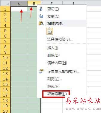 接下來這種方法比較方便一下下就完成了,選擇隱藏列旁邊量列,鼠標移動至A列拖到I列選中,然后右鍵選擇取消隱藏即可。