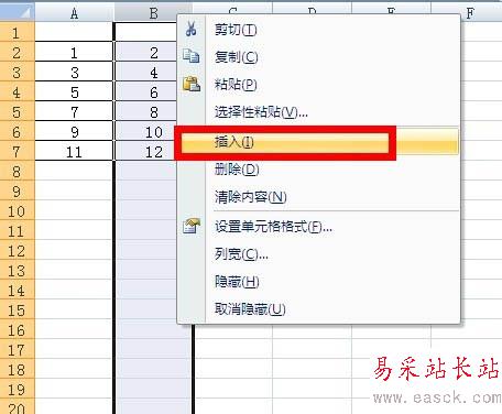 2、首先,選中B列,右擊鼠標(biāo),選擇“插入”,在A和B列新增一列