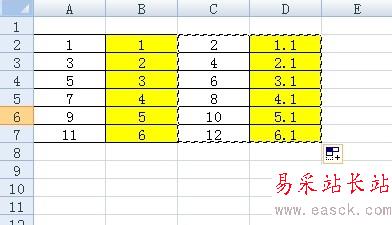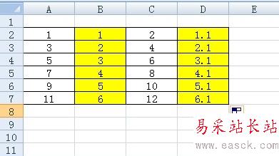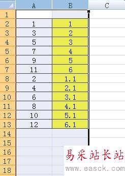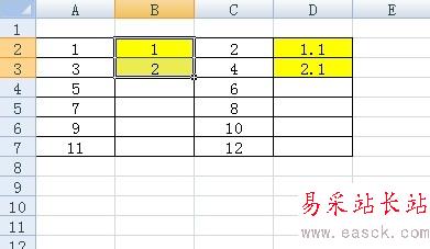 3、在B2中輸入1,在B3中輸入2,選中B2,B3向下填充;在D2中輸入1.1,在D3中輸入2.1,選中D2,D3向下填充