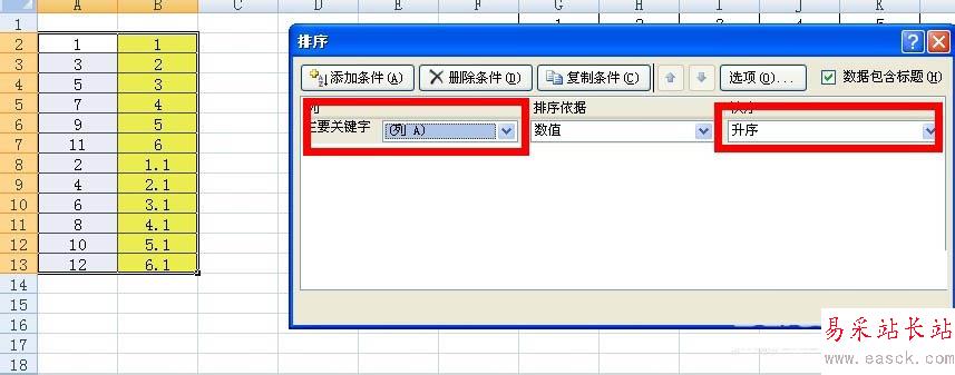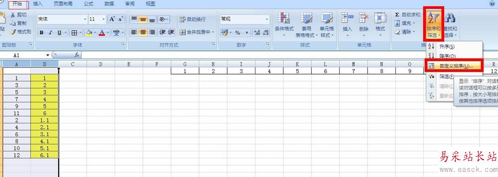 5、選中A、B列,依次單擊“開始”選項卡--“篩選和排序”--“自定義排序”,在“排序”窗口中,選擇按照列A升序排序