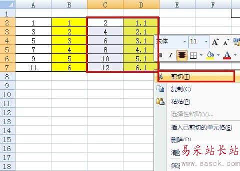 4、選中C2:D7,右擊鼠標(biāo),選擇“剪切”;單擊A8單元格,選擇“粘貼”