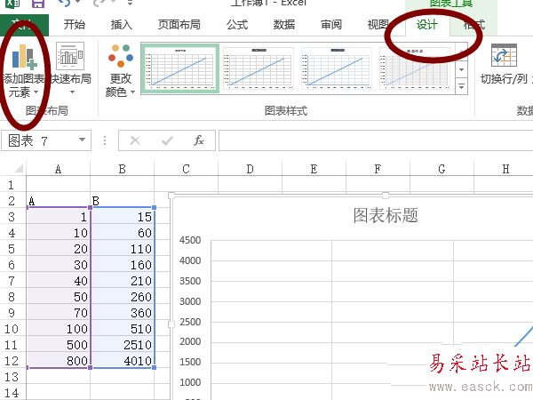 4、接下來,我們為圖表添加次要網格線。先點擊圖表,則在excel軟件的頂部就會顯示“圖表工具”,然后點擊“設計”,則在左側便可看見“添加圖表元素”并點擊