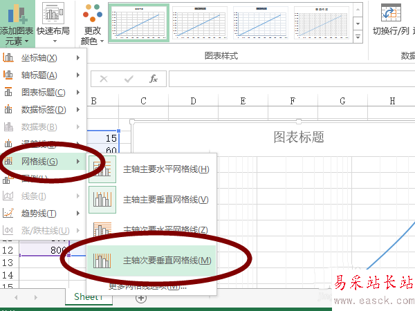 5、找到“網格線”,在子菜單中選擇“主軸次要垂直網格線”,我們便可看到添加的次要網格線,但是默認的網格線顏色較淺,網格并不明顯。下面我們介紹圖表顏色的設置。