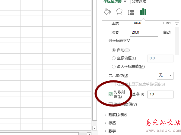 3、然后在右側彈出的菜單中找到“對數刻度”,點擊“對數刻度”左側的小白框,然后便可看到圖表的橫坐標已經變為對數坐標。縱坐標的設置和橫坐標類似,不在贅述。