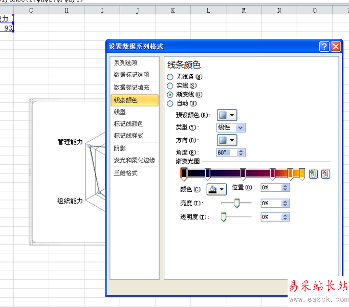 7、接著切換到線條顏色選項卡,勾選漸變色,然后設置相關的參數,可以根據自己的實際情況進行設置。