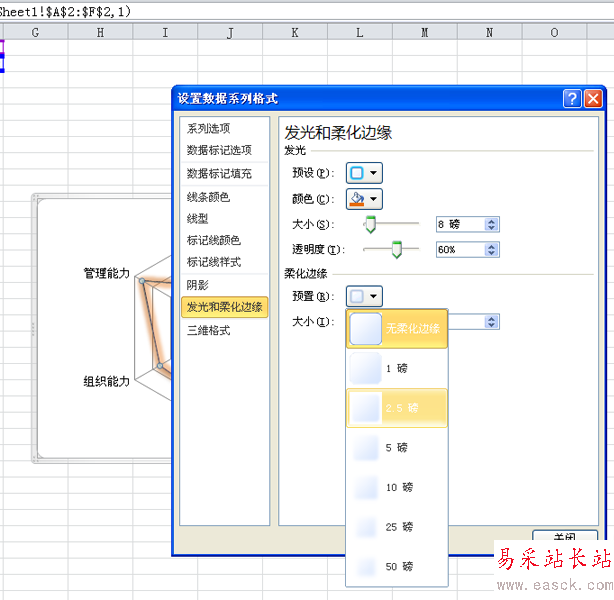 9、切換到發光和柔化邊緣選項卡,預設設置一種自己喜歡的,顏色選擇綠色,柔化邊緣預置為2.5磅,點擊確定按鈕。
