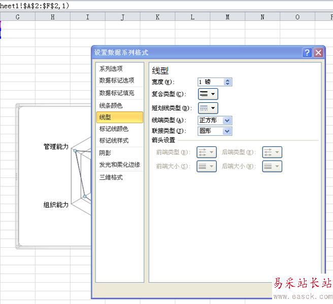 8、切換到線形選項卡,寬度設置為1磅,設置復合類型選項,線端類型設置為正方形。