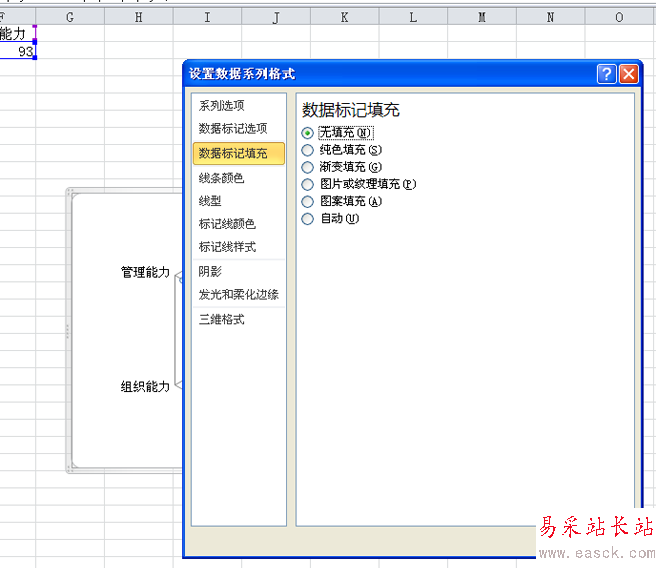 6、在彈出的設置數據系列格式對話框中,切換到數據標記顏色填充,選擇無填充。