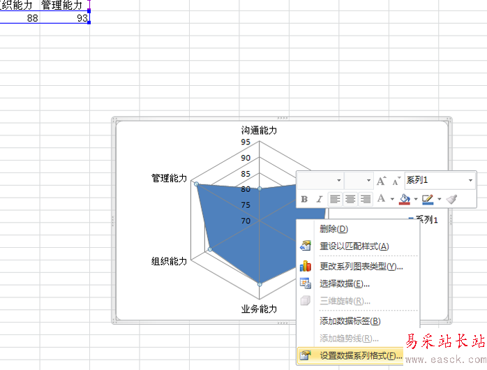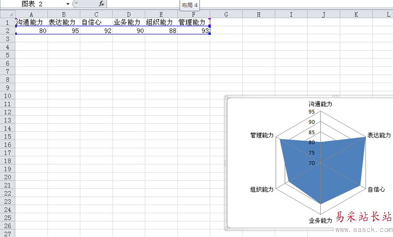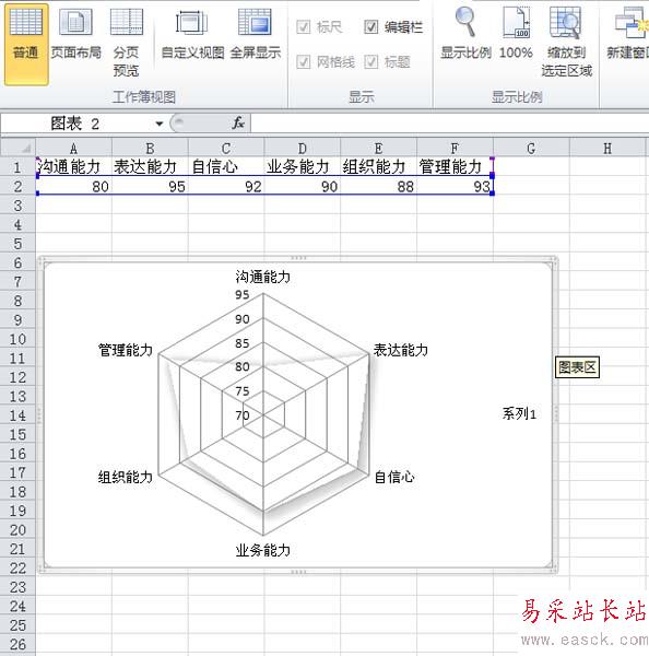 10、這樣雷達圖就制作完成了,修改相應的數據你會看到圖表的變化,可以根據需要進行調整。