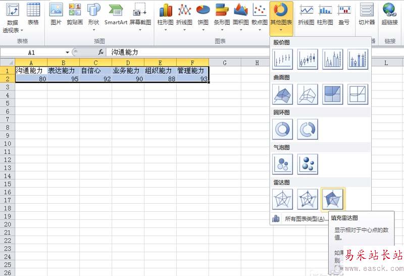 3、選擇數據區域a1:f2,執行插入-其他圖表命令,選擇填充雷達圖。