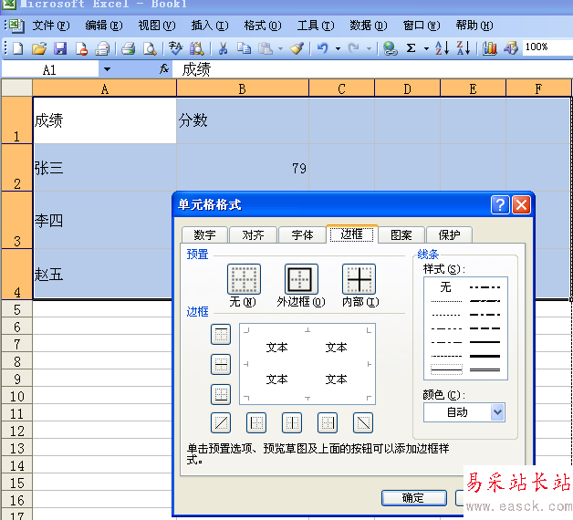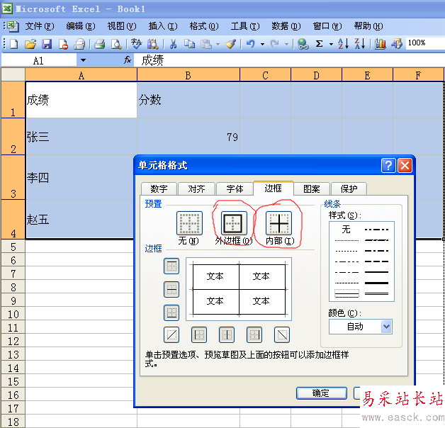 6、我們可以看到“無”、“外邊框”、“內部”三個選擇,根據我們的需要,我們需要點擊“外邊框”和“內部”兩個欄。