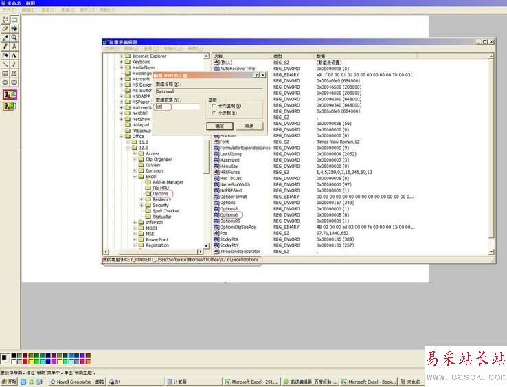 3、左邊依次展開分支:HKEY_CURRENT_USER/Software/Microsoft/Office/12.0/Excel/Options,雙擊右邊的Options6,在彈出來的對話框中“基數”選擇“十進制”,把“數值數據”改成16,如圖