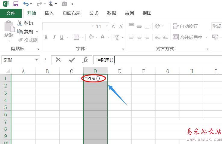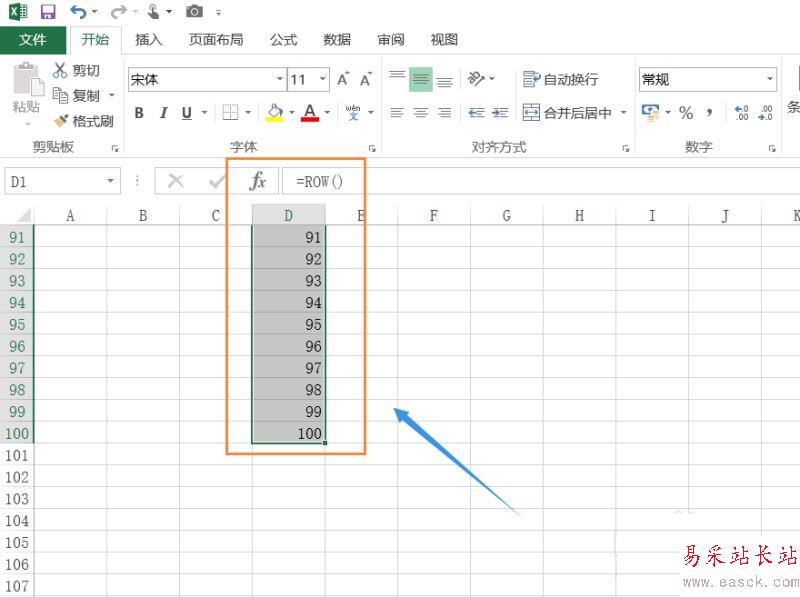②然后在D1列輸入公式"=row()",見下圖;最后同時按住Ctrl+Enter快捷鍵,這樣就完成了序列1到100的快速添加;