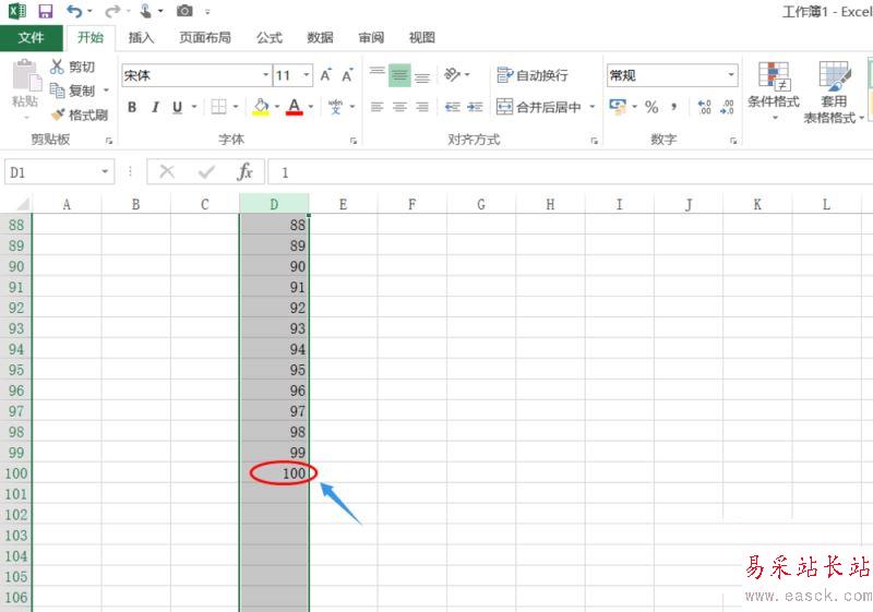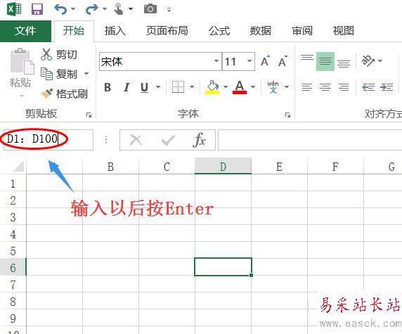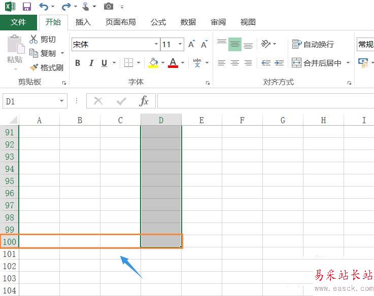 ①在左上角的名稱框我們輸入D1:D100,然后按回車鍵,此時會自動選擇D1到D100所有的列,如圖;