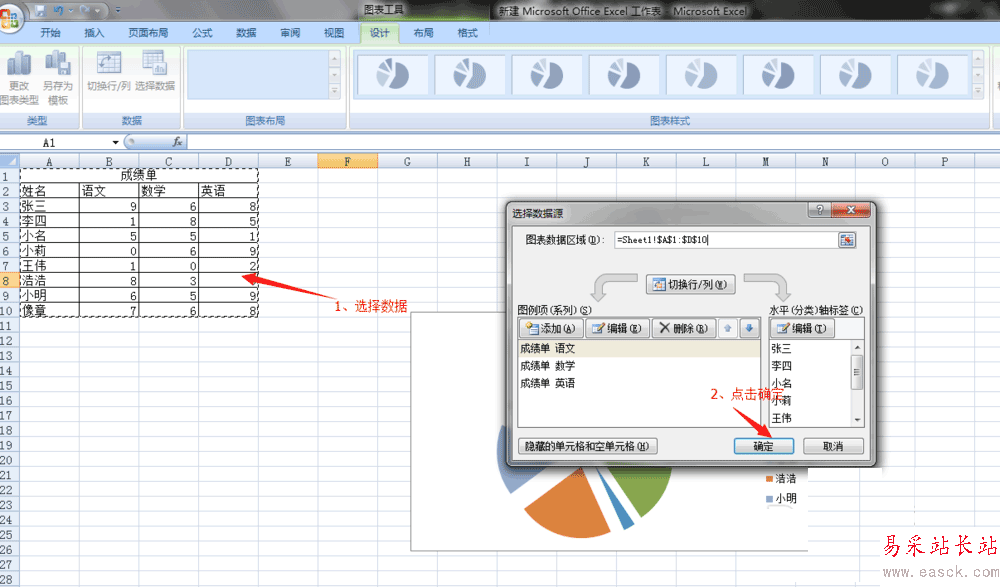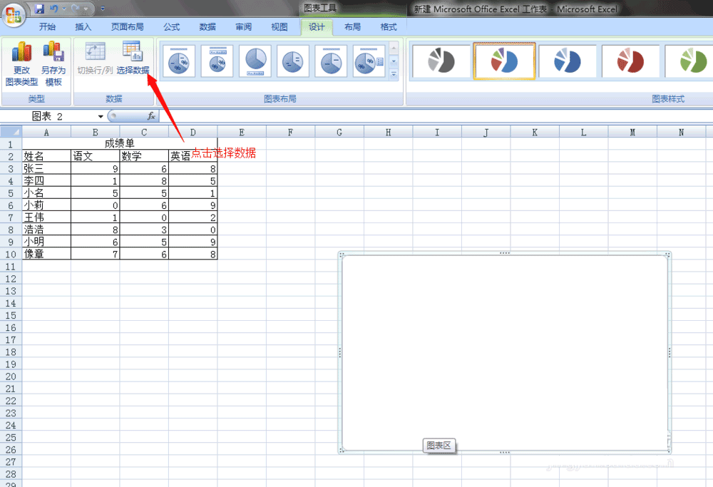 6、點擊餅圖的類型后,出現如下圖,然后點擊”選擇數據“圖標,會彈出一個小窗口,然后選擇我們要創建成圖表的數據,如下面第二張圖所示: