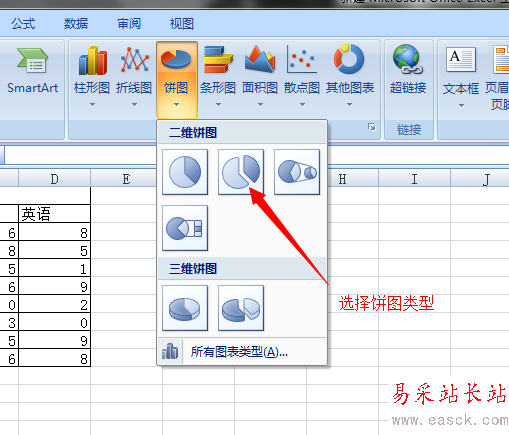 5、點擊”餅圖“圖標后,會彈出一個小窗口,選擇”餅圖“的類型,這里我們以紅標指到的為例,如下圖所示: