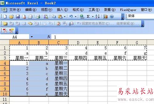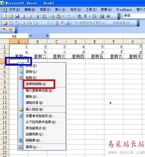 2、復制所有需要行列轉置的內容(A1:G3),然后在A列空的單元格(例如A4)處右擊,如下圖2所示,在彈出的右鍵菜單里選“選擇性粘貼”。也可以選擇在新工作表里進行粘貼。