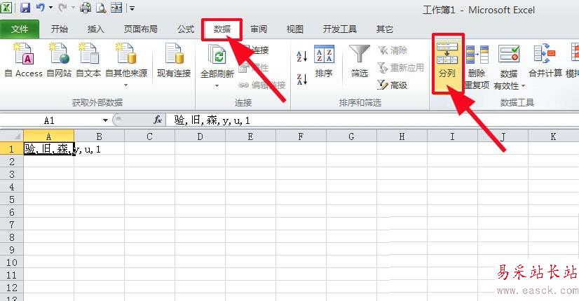 6、這樣子,單元格A1中的字符串“驗,舊,森,y,u,1”已經(jīng)按照半角逗號“,”分列好了。