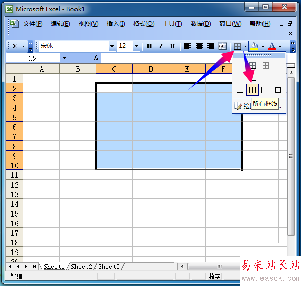 3、點(diǎn)擊工具欄的邊框按鈕,選擇[所有邊框]