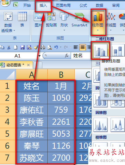 10、選中AB兩列數據,點擊【插入】-【柱形圖】。