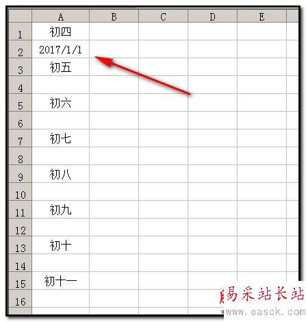 3、光標放在A2單元格右下角,點住不放手,往下拖到A15單元格;再放開鼠標;從A1到A15單元格即隔行顯示了2017/1/1到2017/8的連續日期。