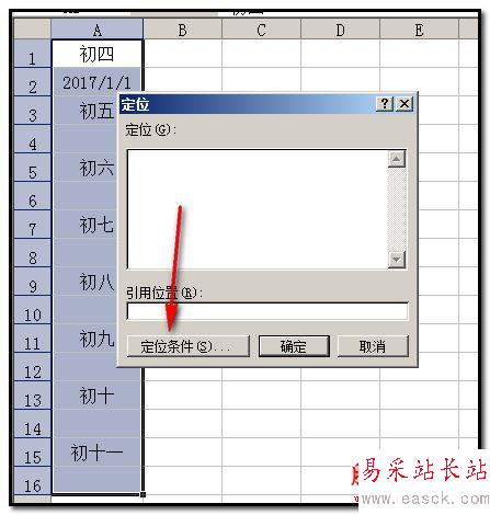 3、再選中A1到A16單元格;接著再按鍵盤的F5,彈出定位設置框;在框內點“定位條件”
