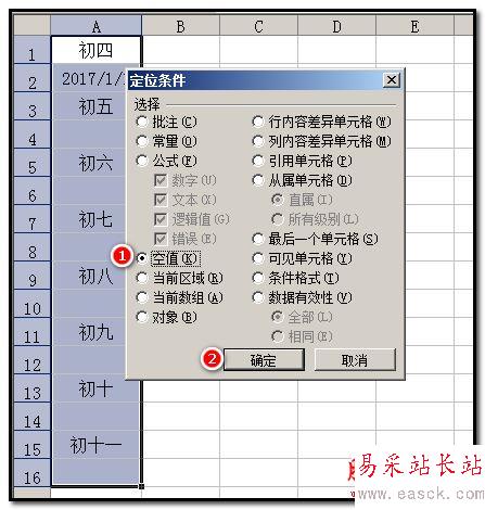 4、彈出“定位條件”設置框;點選“空值”再點確定;