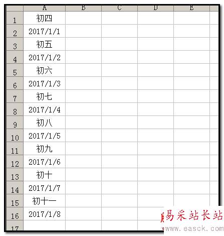 7、按鍵盤的CTRL+回車鍵后,A1到A16單元格中空白無數據的單元格即顯示了從2017/1/1到2017/1/8連續的日期.
