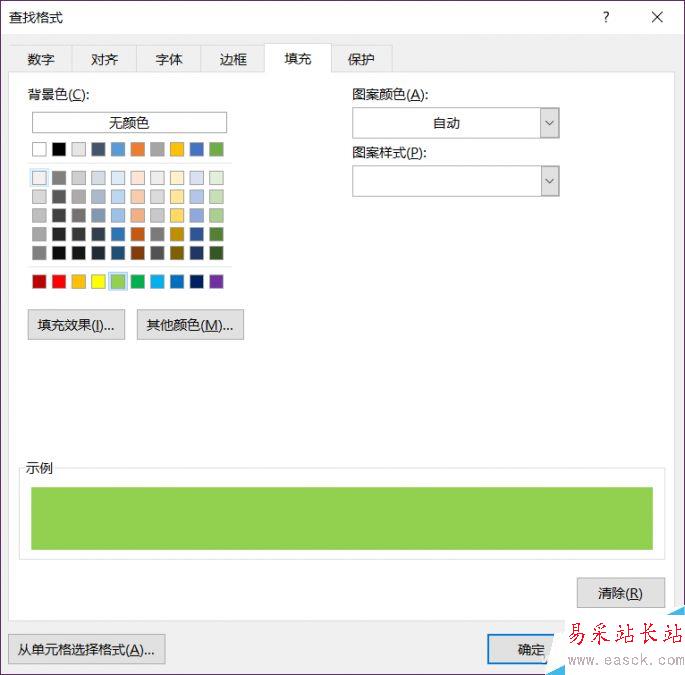 切換選項卡到“填充”,設置顏色為淺綠色,注意這里設置的顏色必須和之前要求和的單元格填充顏色一致。