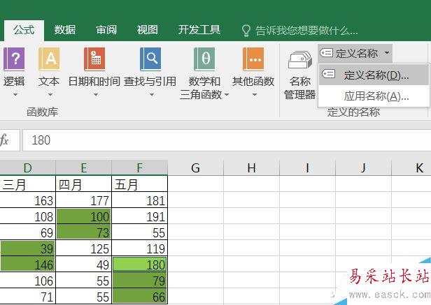 關閉查找對話框后,Excel表格內已經是選定所有淺綠色單元格的狀態,不要點擊任何地方,切換上方工具欄的選項卡到“公式”一項,然后點擊“定義名稱”。