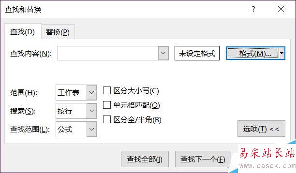 將所有求和計算的單元格都填充顏色后,按下Ctrl+F快捷鍵呼出查找對話框,然后單擊“選項”,這時查找對話框會多出幾個按鈕,點擊“格式”。