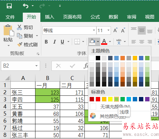 首先,將要被計算的單元格“標記”,其實標記這些單元格有很多方法,小編這里就用顏色區分了。單擊要統計求和的單元格,點擊Excel中填充顏色,統一設置成一種顏色,栗子中選擇了淺綠色。