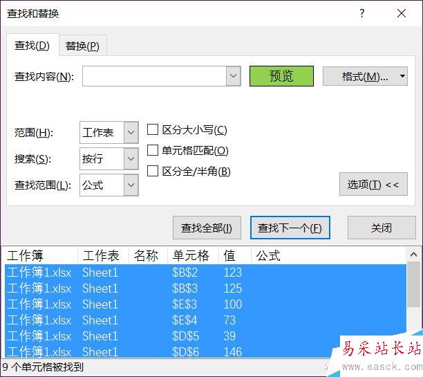 確認后回到查找對話框點擊“查找全部”,這時候就會將所有設置為淺綠色的單元格都羅列出來,點擊第一條然后按住Shift下拉到底部選中最后一條,這樣就圈選了所有被查找到的淺綠色單元格。