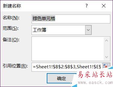 在新建名稱中填寫一個關鍵詞,比如“綠色單元格”,這個名稱可以自己定義,但最好是對應顏色的,這樣比較方便記憶。